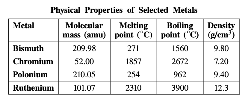 A cube of an unknown metal has a volume of 2.25 cm3 and a mass of 16.2 g. Based on data in the table above, what is the identity of this metal?