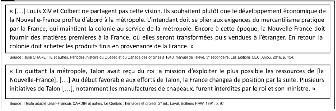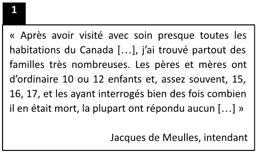 Des politiques d’immigration et de natalité ont été mises en place en Nouvelle-France dans la deuxième moitié du 17e siècle. Inscrivez le numéro du document qui présente une cause de ces politiques et le numéro de celui qui en présente une conséquence.