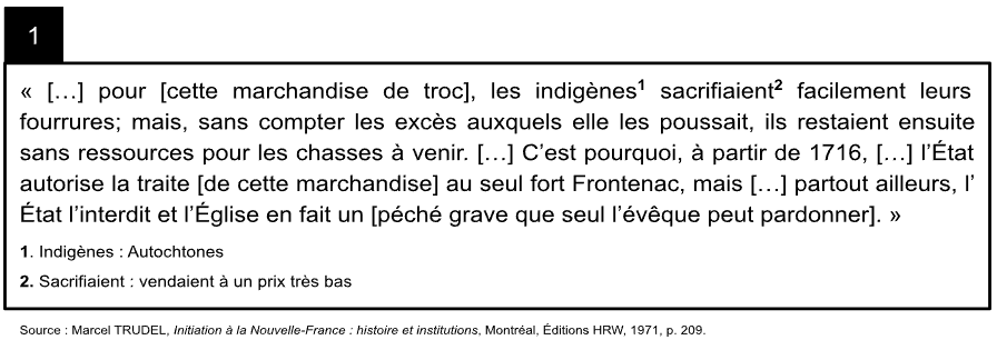 Au cours du 17e siècle, l’Église s’oppose à l’utilisation d’un produit d’échange dans la traite des fourrures avec les Autochtones. De quel produit s’agit-il?