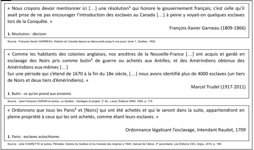 Le document ci-dessous présente la position de trois acteurs à l’égard de l’esclavage en Nouvelle-France. Nommez l’acteur qui présente une position différente et comparez sa position à celle des deux autres acteurs.