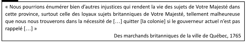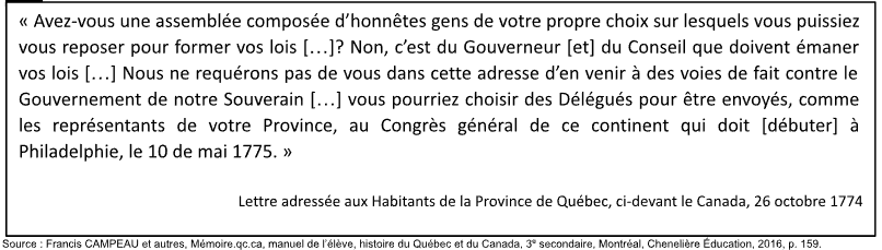 À l’aide du document suivant, indiquez une cause de l’application de l’Acte de Québec en 1774.