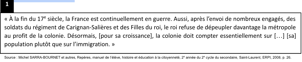 Les documents 1 à 4 font référence au peuplement de la Nouvelle-France. Indiquez si les faits présentés dans ces documents se déroulent avant ou après le Gouvernement royal.