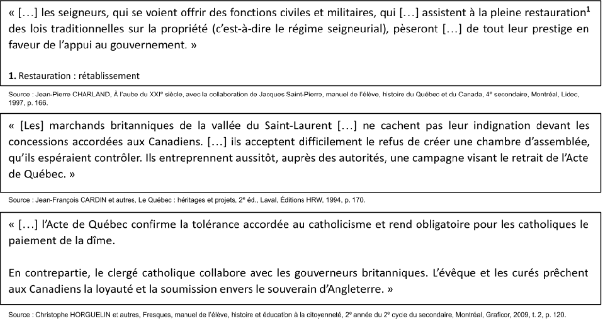 Les documents 1 à 3 présentent les revendications de différents groupes sociaux au lendemain de la guerre de la Conquête. Inscrivez à l’endroit approprié le numéro du document correspondant à chacune des positions des groupes sociaux.