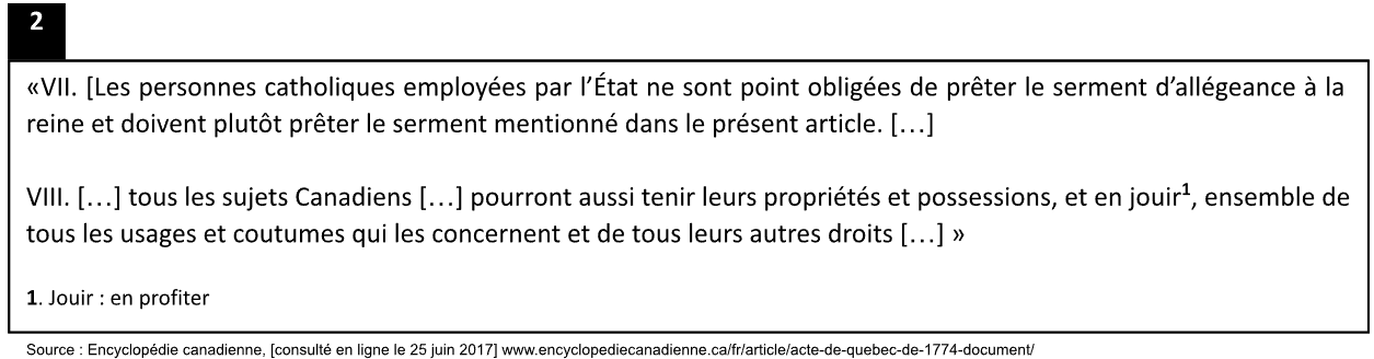 Le document 1 présente la position de trois acteurs à l’égard de l’Acte de Québec. Nommez l’acteur qui présente une position différente et comparez sa position à celle des deux autres acteurs.