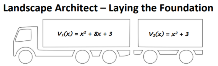 A company uses a cargo delivery truck to transport the loads of woodchips to the schools for their playgrounds. There are two differentsized trailers connected to the truck. Both trailers will be filled with bags of woodchips to enhance the outdoor learning spaces, or playgrounds. The first trailer can transport x2 + 8x + 3 cubic feet at full capacity, and the second trailer can transport x2 + 3 cubic feet at full capacity. The truck makes 15 trips back and forth to the warehouse to refill the truck at full capacity with bags of woodchips in each trailer for each trip in order to satisfy the order for all schools.