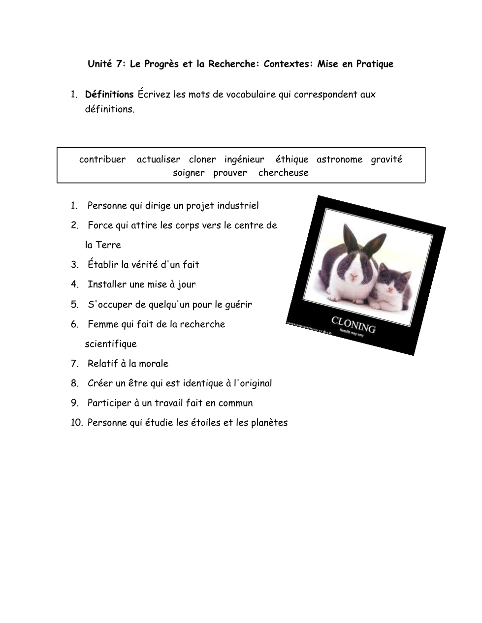 Allez à puzzlemaker.com. En partenaires, créez un puzzle avec 10 définitions pour 10 nouveaux mots de vocabulaire. Echangez votre puzzle avec un autre groupe. (Imprimez-les) Finissez demain