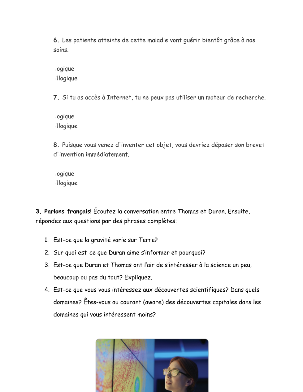 De quoi parle-t-on? Écoutez les mini-conversations et indiquez si on parle de l'informatique, des sciences médicales ou de l'astronomie