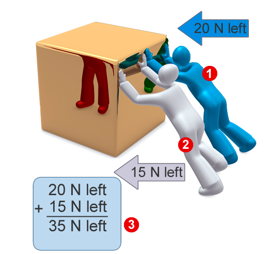 It should take a net force of 25 N to move a box. Tina tries to push the heavy box with 10 N of force to the right. It does not budge. She gets tired and takes a break. Then, Carla pushes it with 15 N of force to the right, and still cannot move the box.