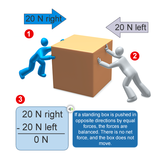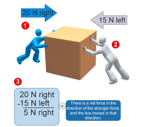 When forces are working in opposite directions, the smaller force should be subtracted from the larger force. The object always moves in the direction of the larger force. Select the buttons in numerical order to see how to calculate the net force.