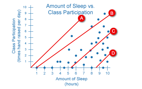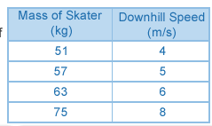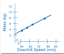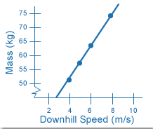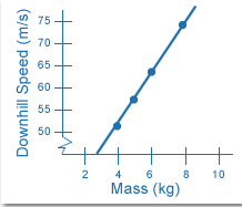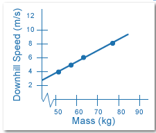 Jack observes that the mass of a skater affects how fast the skater travels on a skateboard. He organizes his data on a line graph. Which of the following line graphs represents his data?