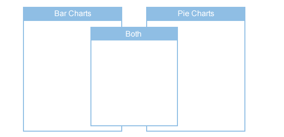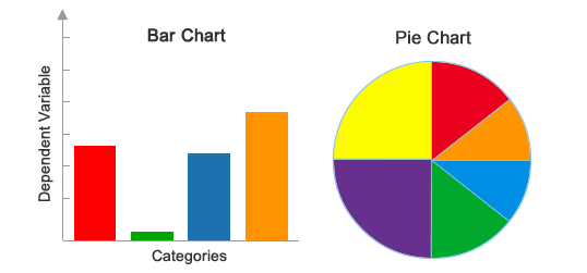 Pie charts and bar charts can be used to compare data composed of two or more categories. A bar chart is a chart used to display data organized in distinct categories. A pie chart is a circular chart that is divided into slices to show the numerical proportion of each category.
