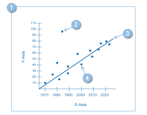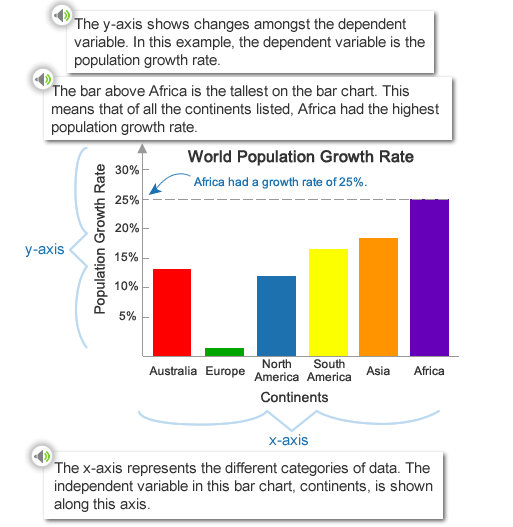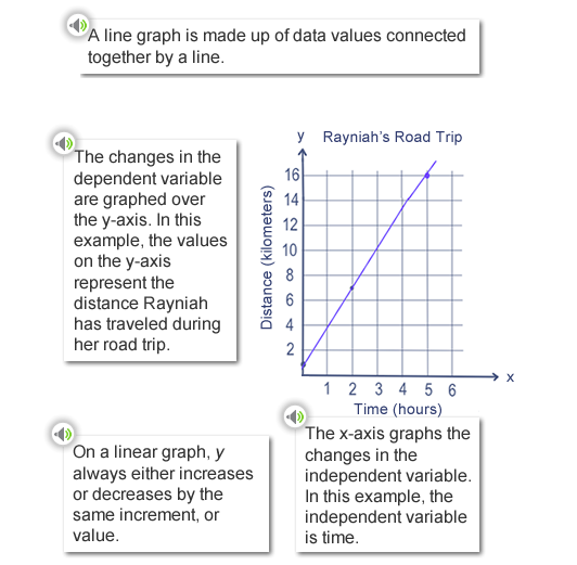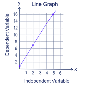 A line graph shows how the dependent variable changes in response to an independent variable over time.