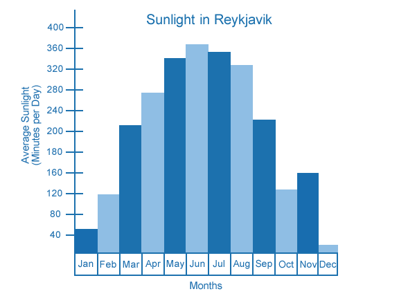 The bar chart below shows the average amount of sunlight in Reykjavik, Iceland, for the year. On average, __________ has the most sunlight per day, while __________ has the least amount of sunlight per day.