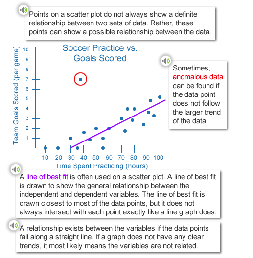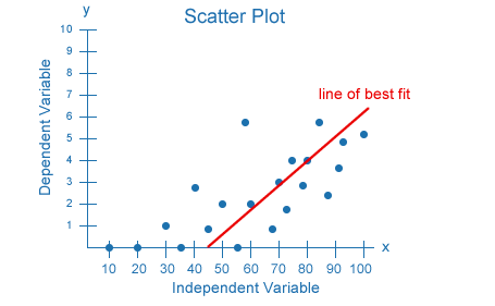 Scientists can also use scatter plots to represent data. A scatter plot is a graph that has plotted points and is used to show the relationship between two variables. Scatter plots, like line graphs, have a horizontal x-axis that usually represents the independent variable and a vertical y-axis that typically represents the dependent variable.
