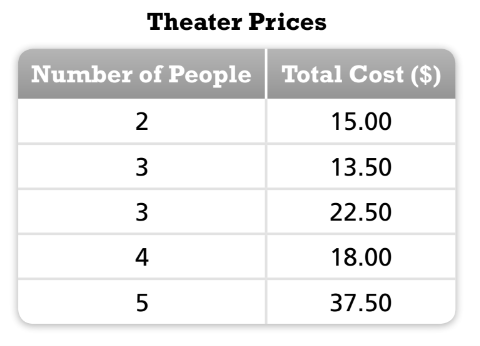 (Level 3) The table shows the number of people and the total cost of their movie tickets at various movie theaters. Complete the scatter plot in the workspace to represent the data. Be sure to use appropriate scales, labels, and choice of y-axis.