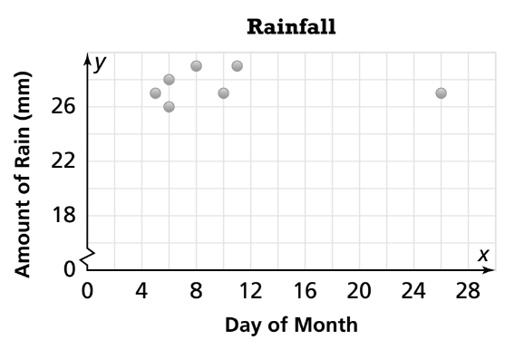 (Level 3) The scatter plot shows the day of a month and the amount of rain in a city. Select all statements that apply.
