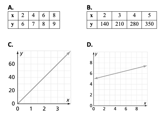 (Level 2) Identify all the relationships that represent a constant rate of change.