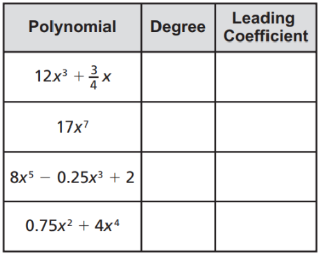 Complete the table with the correct values for the degree of the polynomial and its leading coefficient.