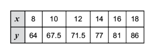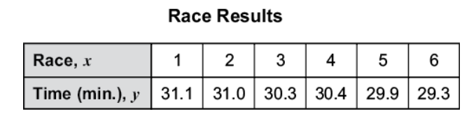 A runner competes in six races of the same distance. Which equation models the line of best fit for the data? The results are shown in the table.