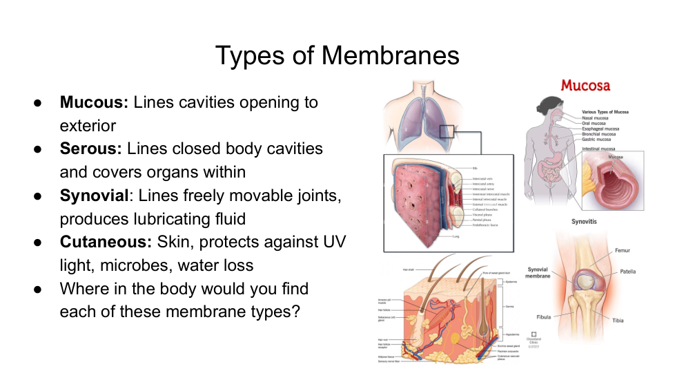 Mucous membrane | arrow_right_alt | Lines cavities opening to exterior |