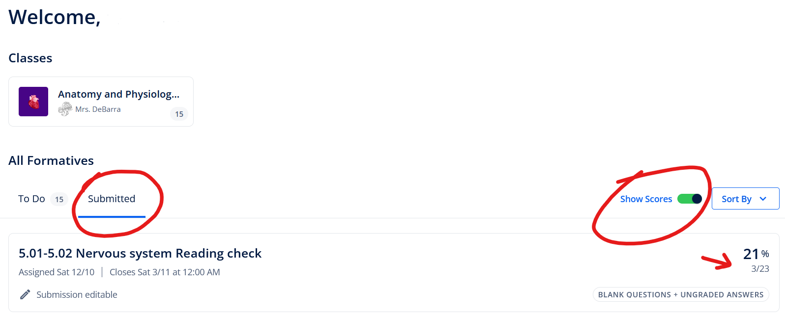 You can also see the points earned by visiting your Formative homepage as I've shown below. I will be updating scores in the gradebook over the next week but let me know if you've made corrections that I haven't updated yet.