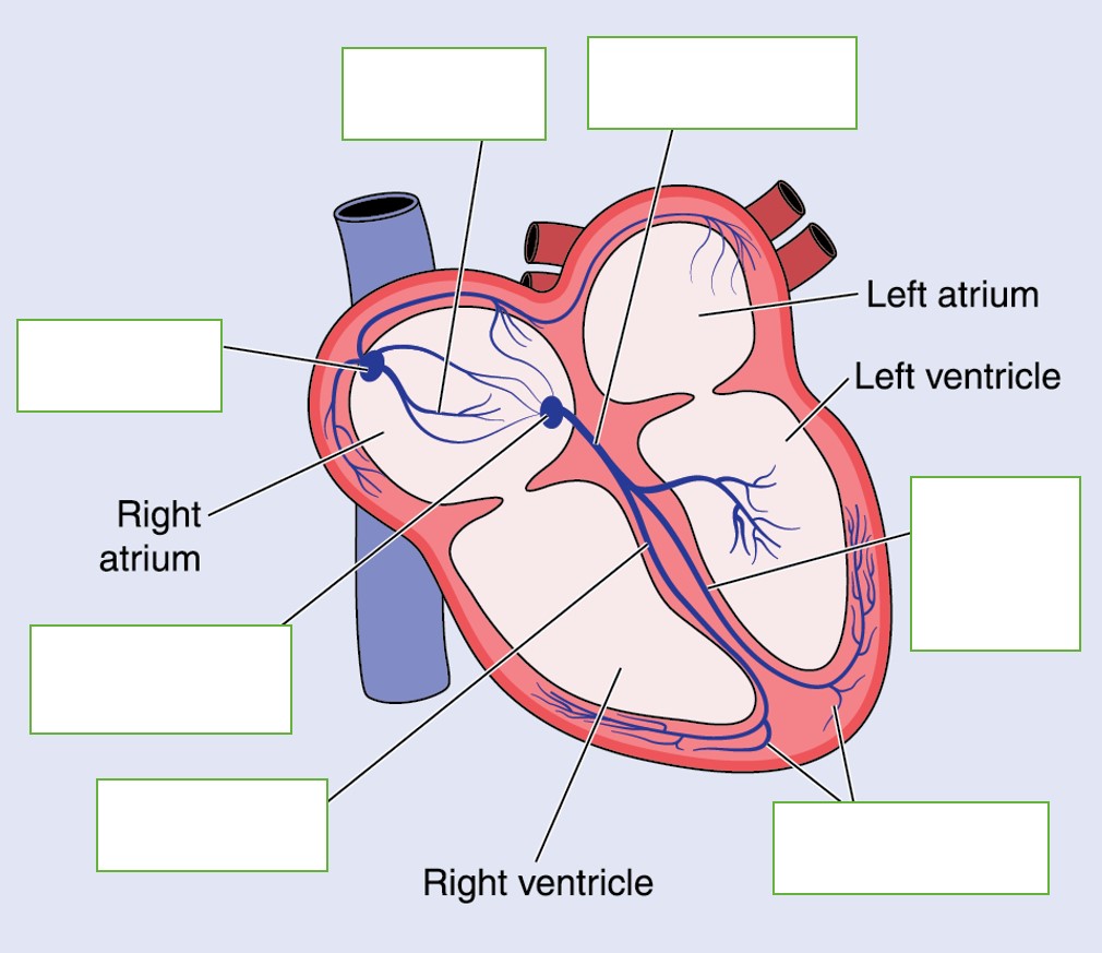 After the electrical impulse reaches the AV node (the area between the atria and ventricles), put the areas below in order to show the flow of the electrical impulse through the heart.