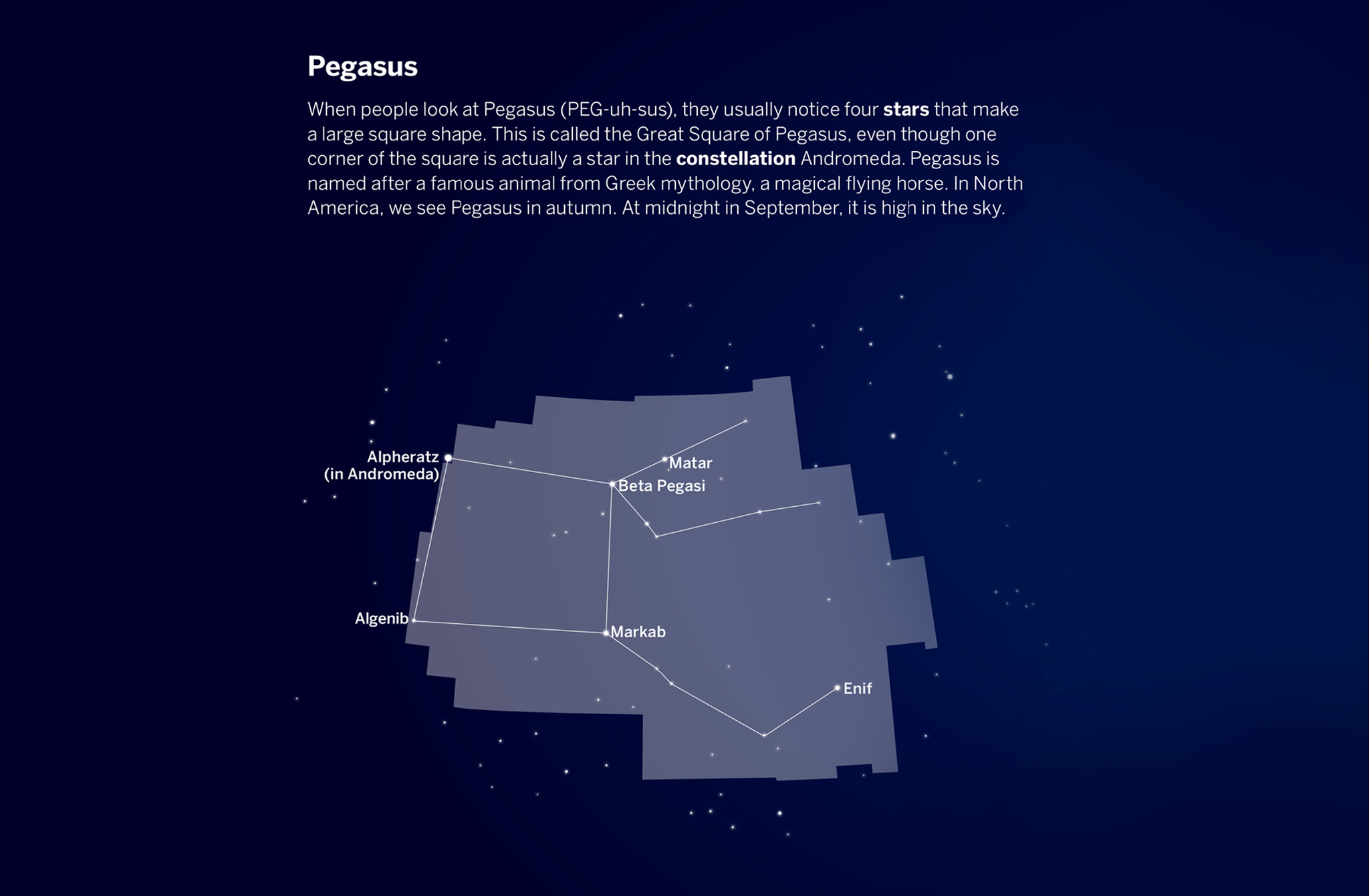 When people look at Pegasus (PEG-uh-sus), they usually notice four stars that make a large square shape. This is called the Great Square of Pegasus. Pegasus is named after a famous animal from Greek mythology, a magical flying horse. In North America, we see Pegasus in the fall, in September it is high in the sky.