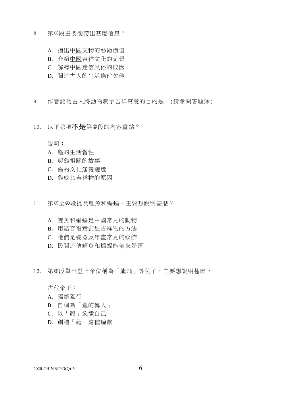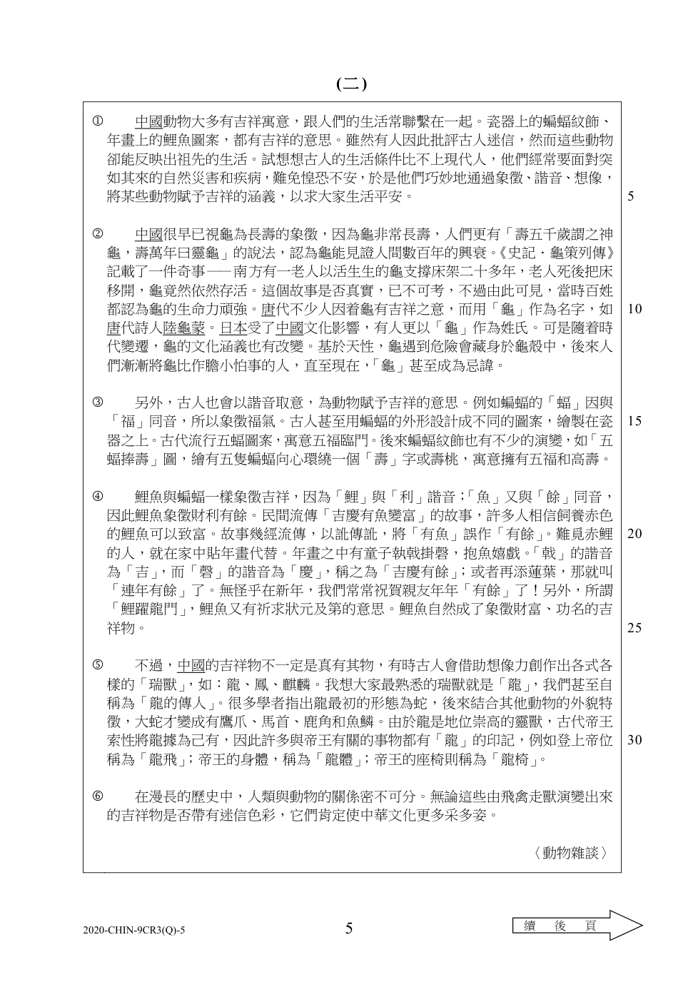 作者認為古人將動物賦予吉祥寓意的目的是: (請參閱答題簿)