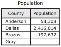 The table shows the population of three Texas counties. The population of Gray County is missing.