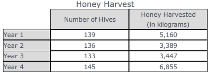The table shows the number of hives a beekeeper maintains and the amount of honey harvested from the hives over four years.