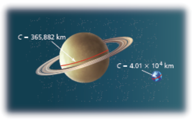The approximtae circumferences of Earth and Saturn are shown. How many times greater is the circumference of Saturn than the circumference of Earth?