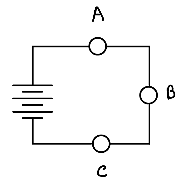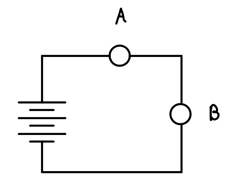 In the circuit below, bulb A uses up some moving charge, so less reaches bulb B.