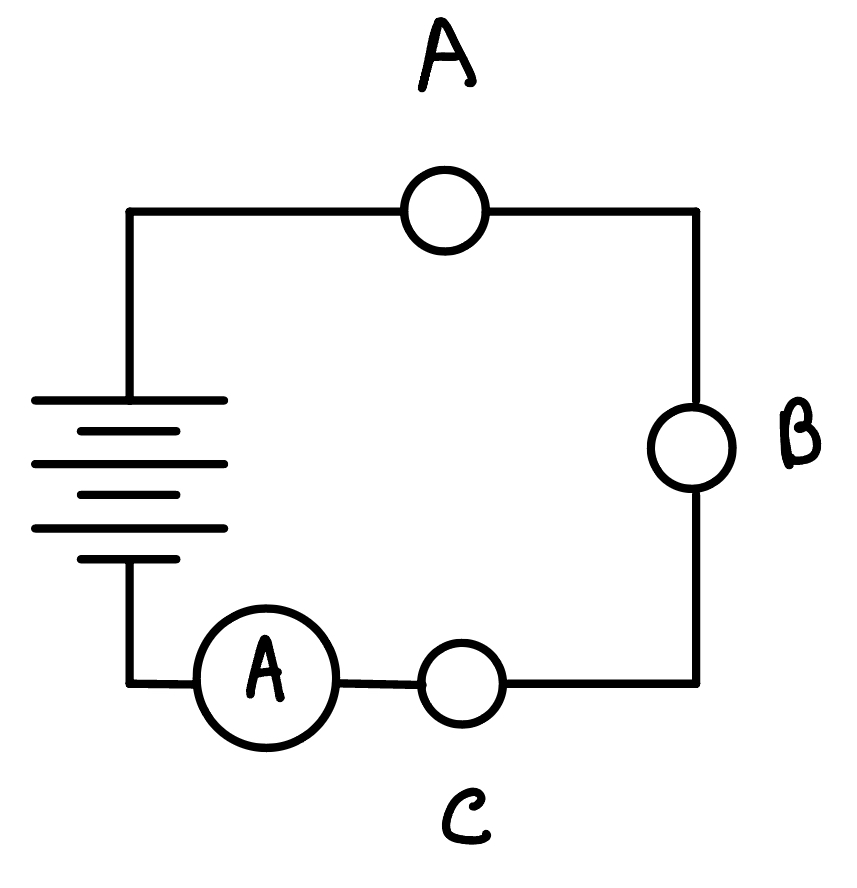 The circuit below originally contained two bulbs (A and B). When bulb C was added, the amount of current shown on the ammeter