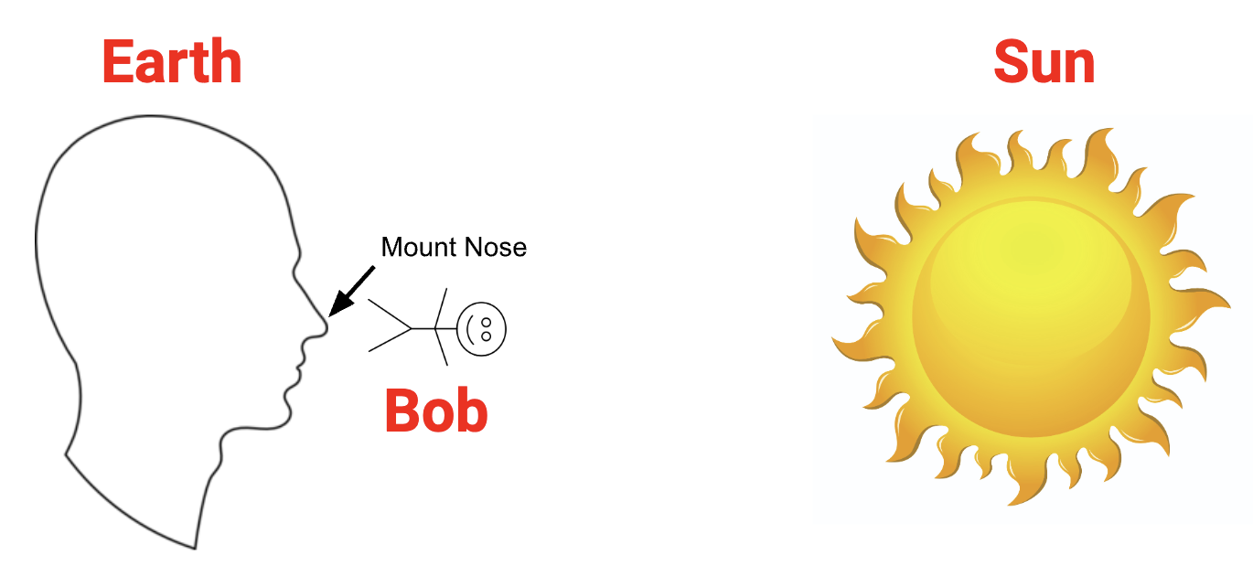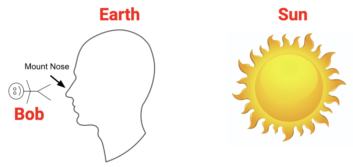 For this model, we are going to use our heads as the Earth. We are going to pretend our nose is a giant mountain on Earth called Mount Nose. If we imagine a person camped at the top of Mount Nose it will allow our eyes to see what that camper on Mount Nose when they look at the sky.