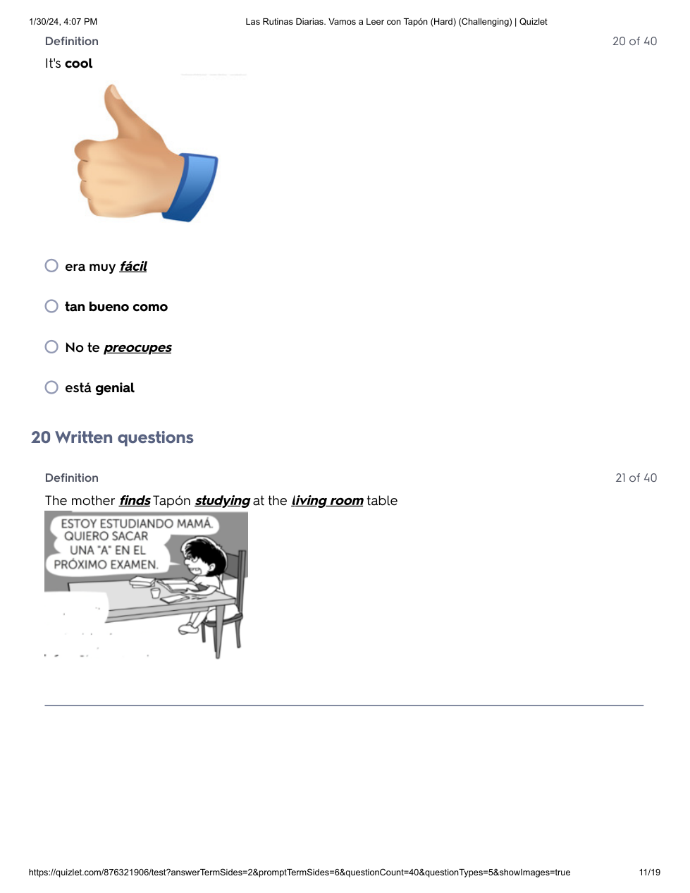 la mamá encuentra a Tapón estudiando en la mesa de la sala | arrow_right_alt | What are you all talking about? |