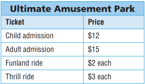 Write an expression that shows the cost of one adult admission ticket and 9 thrill ride tickets?