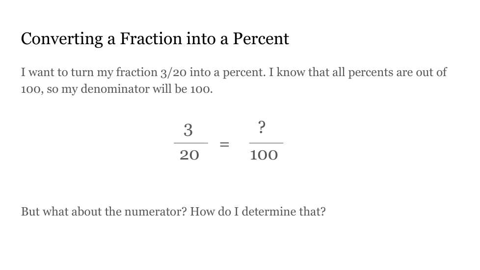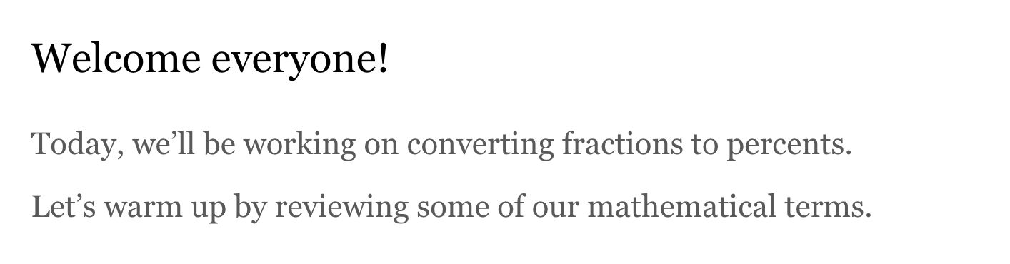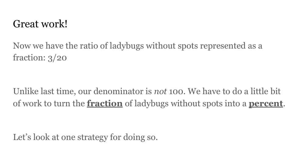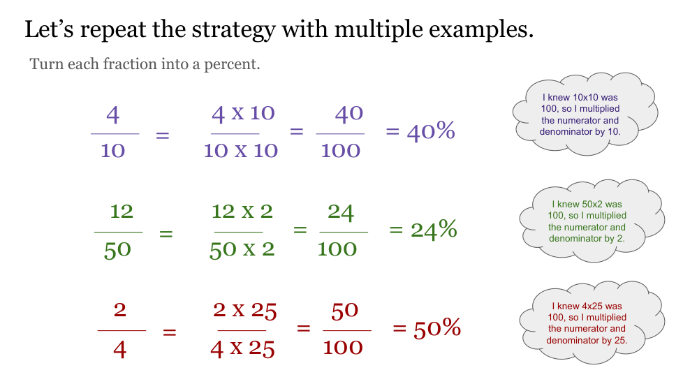 For your Exit Ticket, come up with your own fraction → percent problem. Or share a question you have.