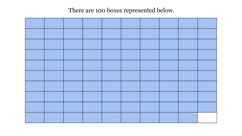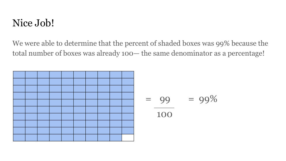 Write the ratio of shaded boxes to total boxes as a percent (per 100).