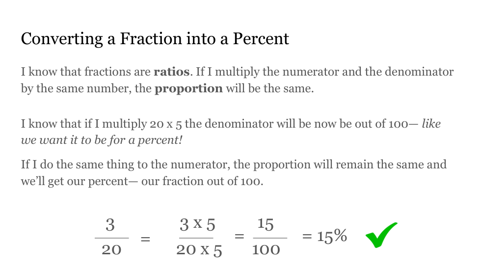 In this lesson, we will be converting "friendly" fractions into percents. We will go through this lesson together during class.