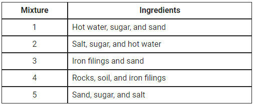 A student mixes salt, iron filings, and water. Explain what happens to the physical properties of each material when it is mixed. Then, describe how the student could separate the iron and salt from the water.
