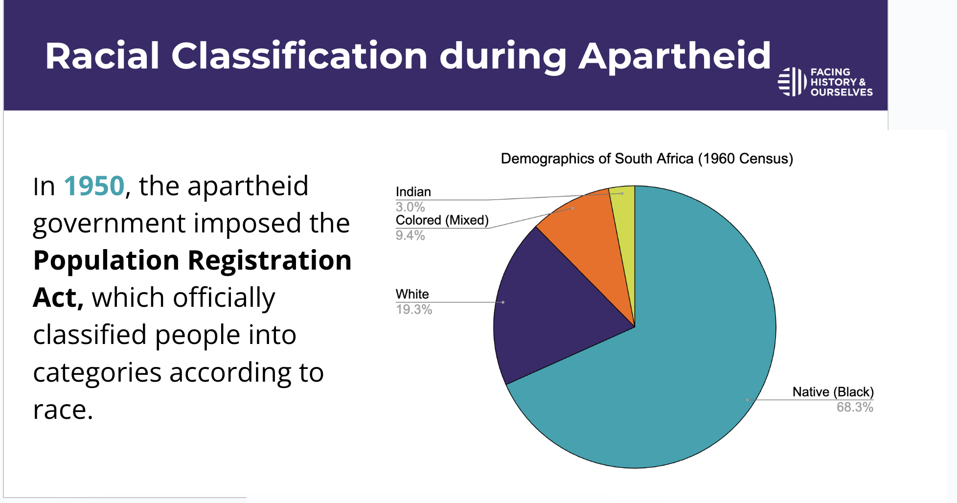 Examine the pie chart in this image. What conclusions can you draw about race during Apartheid? Write 2-3 sentences.