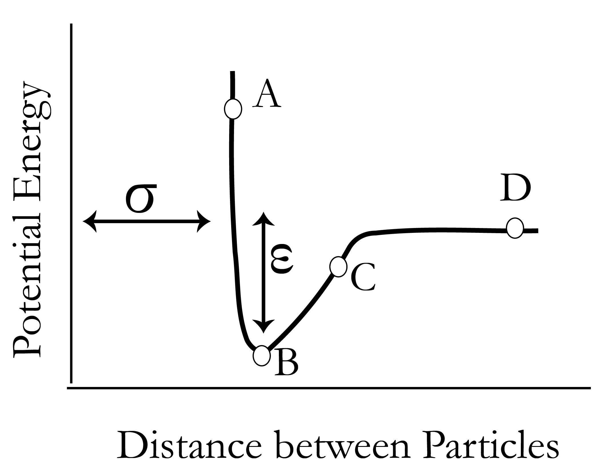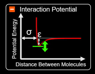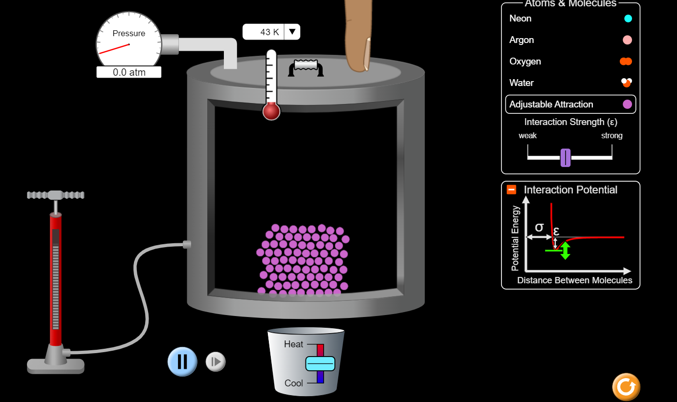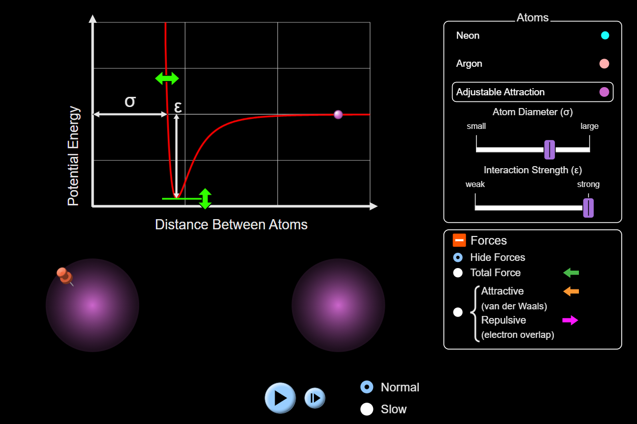 The interaction strength slider changes the strength of the attractive forces between the particles. The length of arrow marked with the ε is proportional to the potential energy related to the attractive force between the particles. Play with the slider and write a sentence to describe the relationship between the potential energy and the strength of the attractive force between the particles.