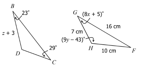 If ∆BCD ≅ ∆FGH, solve for x, y, and z.