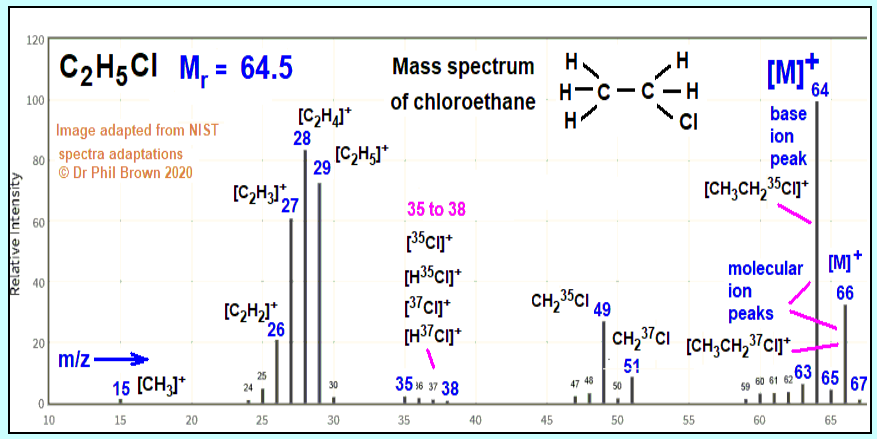 Identify the molecular ion peak for chloroethane with a 35Cl isotope