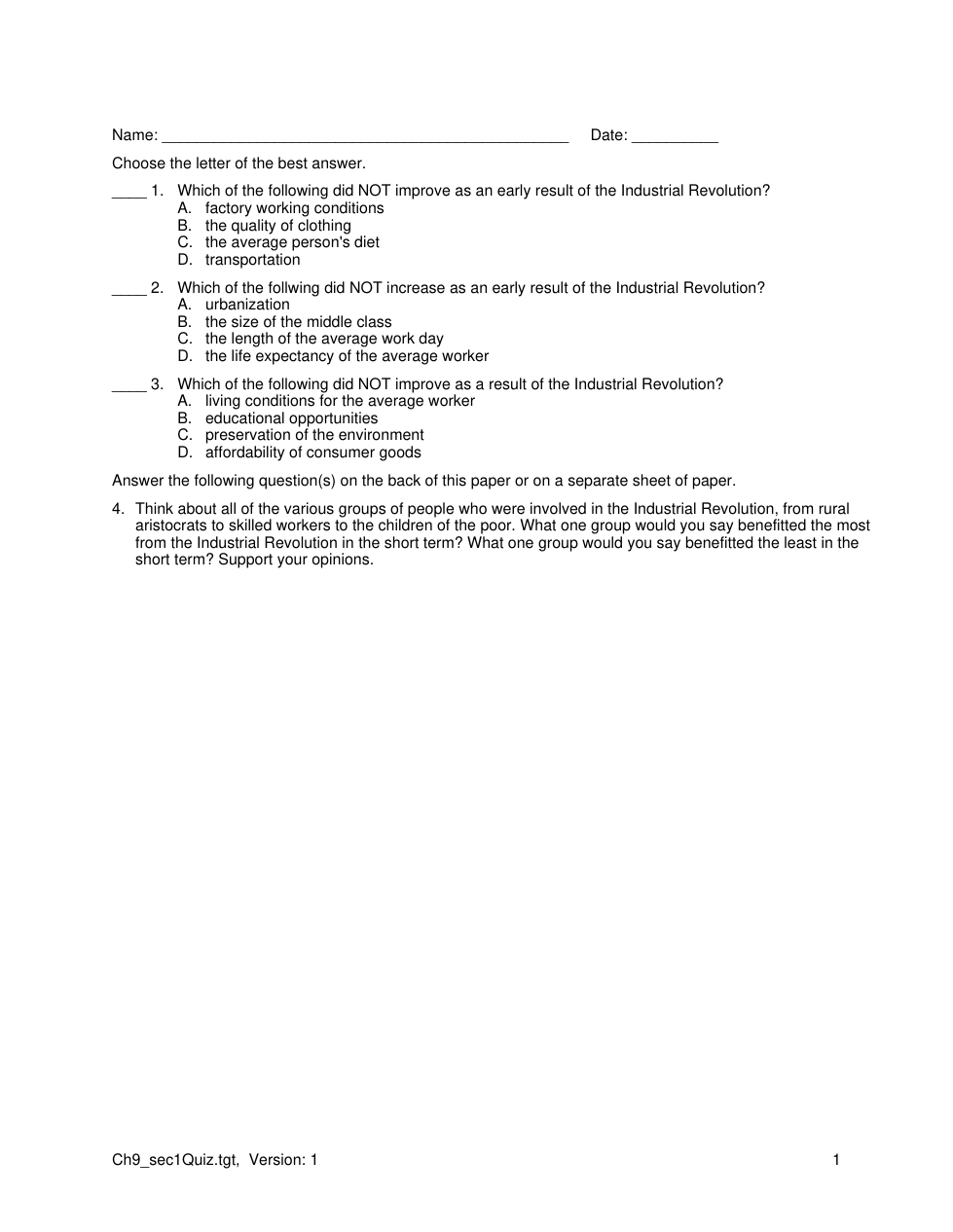 Think about all of the various groups of people who were involved in the Industrial Revolution, from rural aristocrats to skilled workers to the children of the poor. What one group would you say benefited the most from the Industrial Revolution in the short term? What one group would you say benefited the least in the short term? Support your opinions.