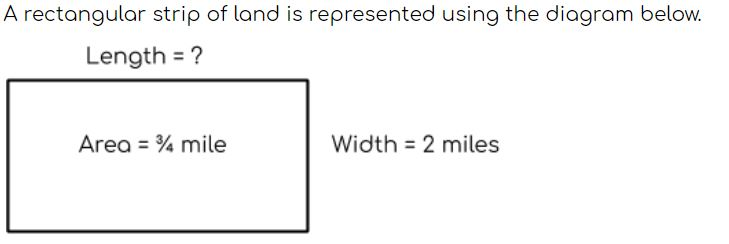 To find the LENGTH of the land, the area of the land must be divided by the width of the land. How long, in miles, is the strip of land? Show your work and simplify your answer.