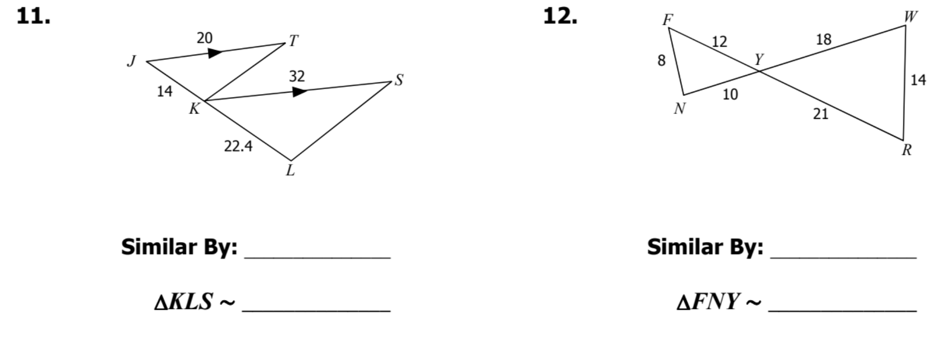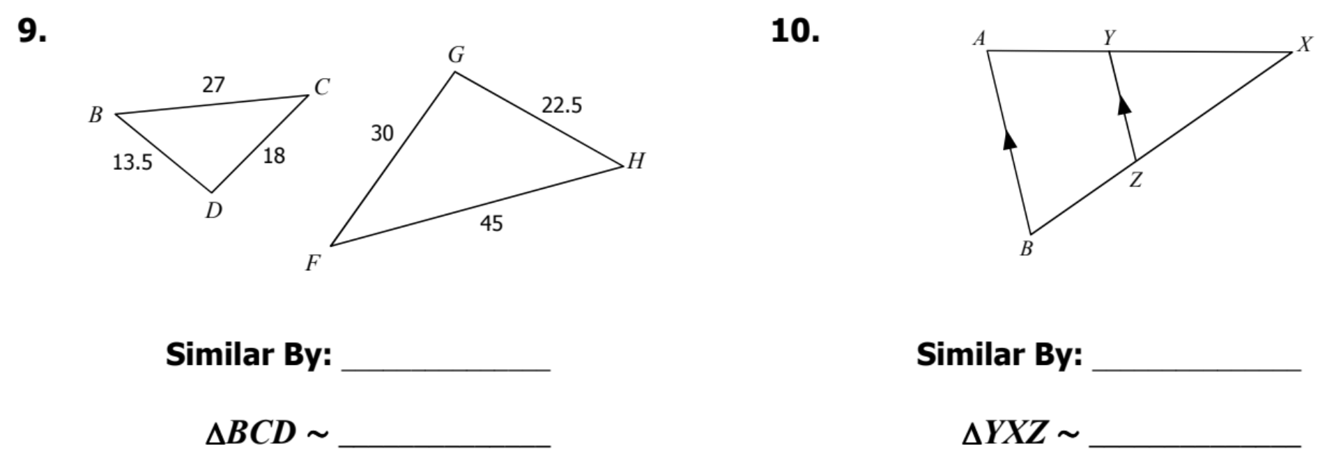 Determine if the triangles are similar. If similar, state how and complete the similarity statement.