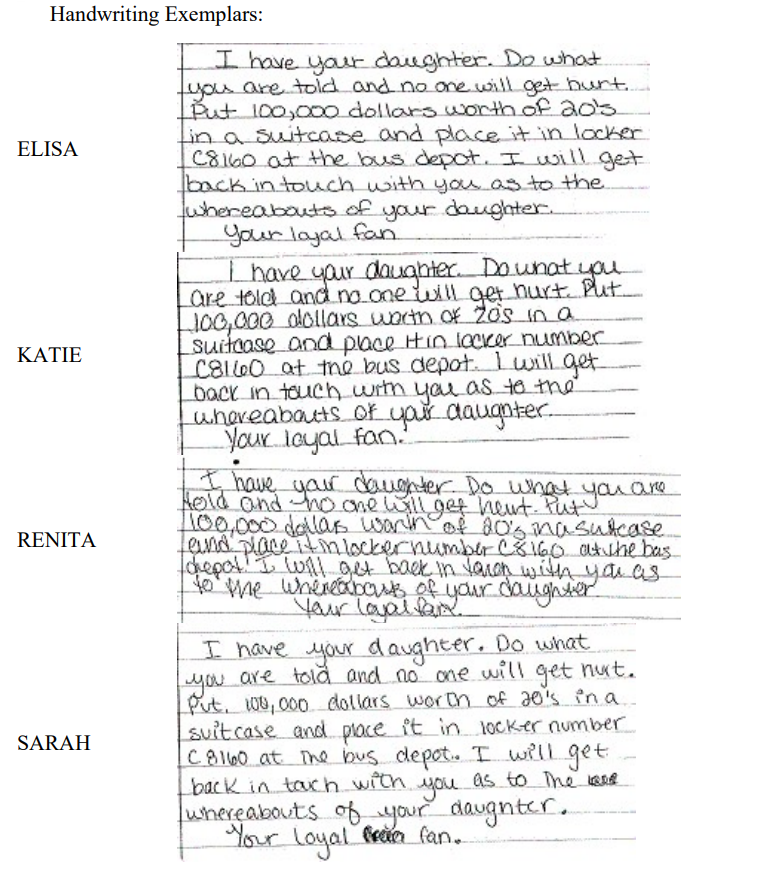 Which if any of these suspects wrote the above document? Give at least 5 characteristics that support your claim.