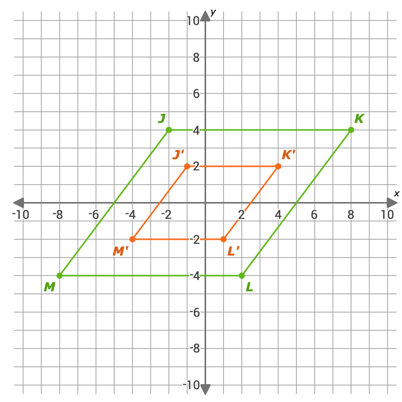 The parallelogram JKLM is shown on the coordinate grid. It will be dilated with the origin as the center of dilation using the rule (x, y) --->(ax, ay) to create J'K'L'M'. If the vertex K' will be located at (4, 2) What is the scale factor of a?