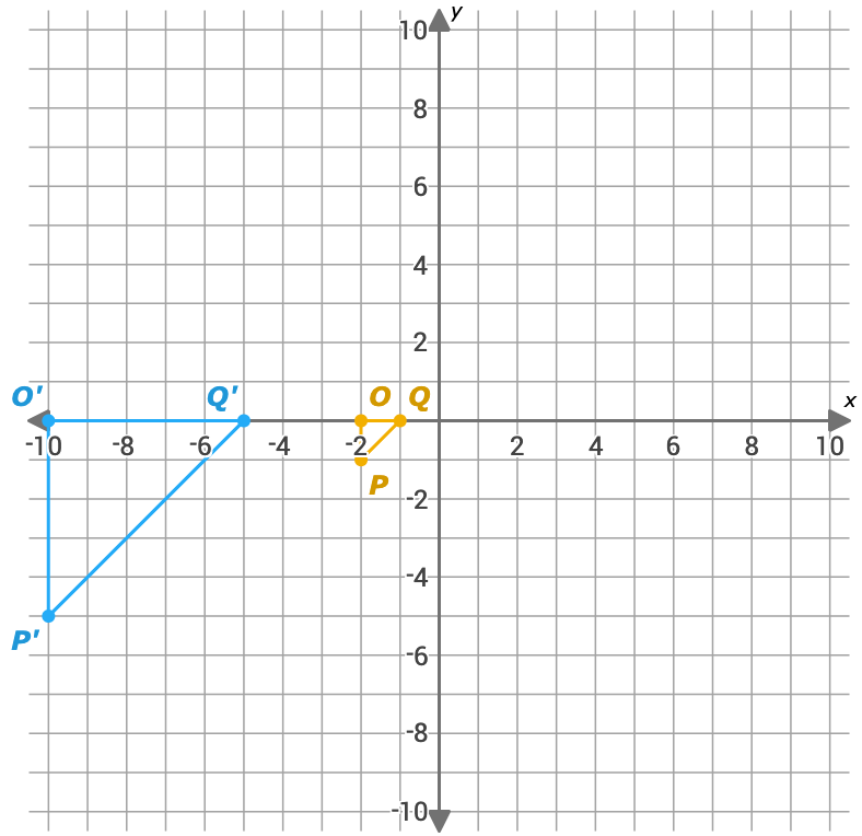 The Triangle OPQ is shown on the coordinate grid. It will be dilated with the origin as the center of dilation using the rule (x, y) --->(ax, ay) to create O'P'Q'
